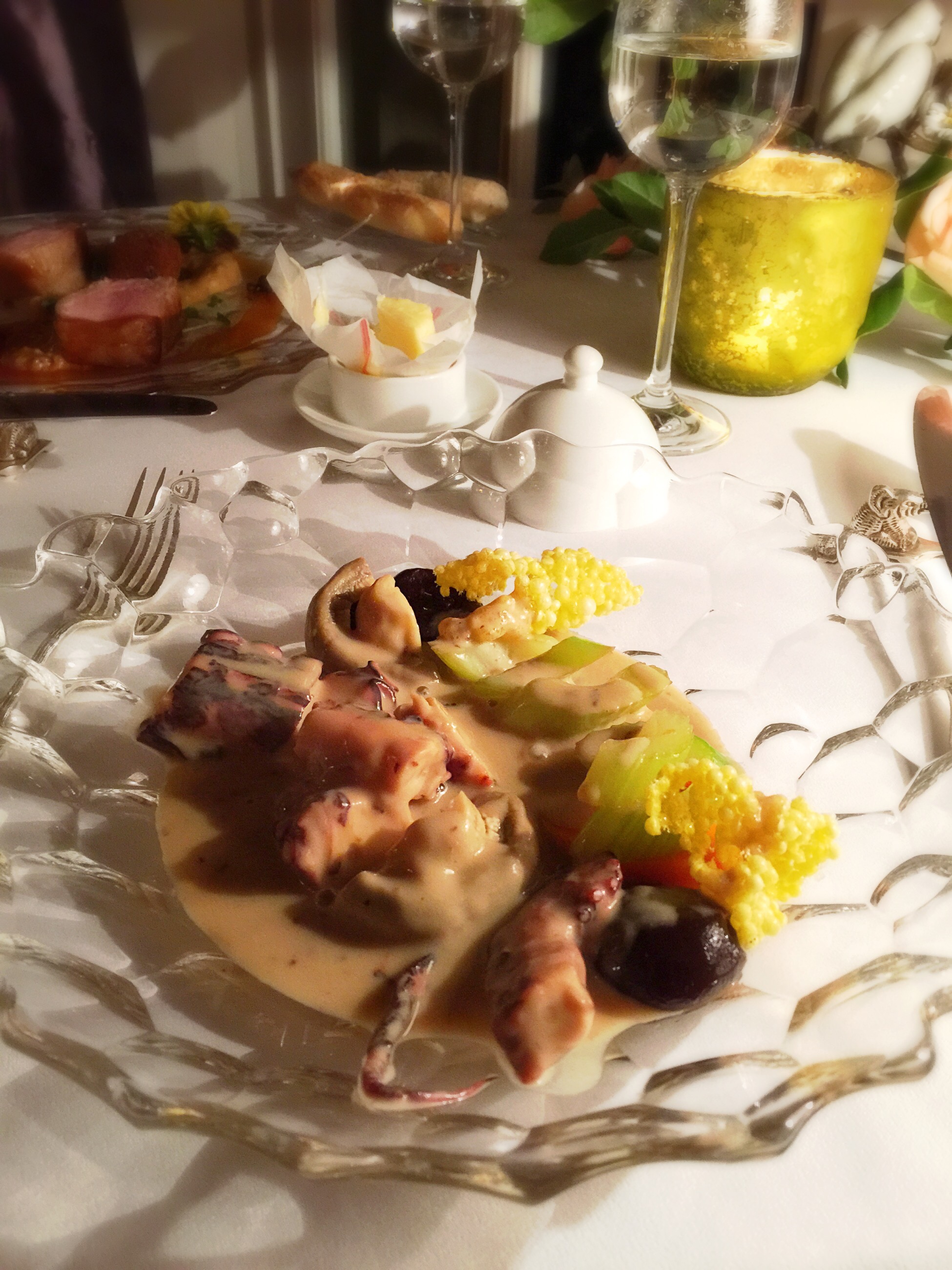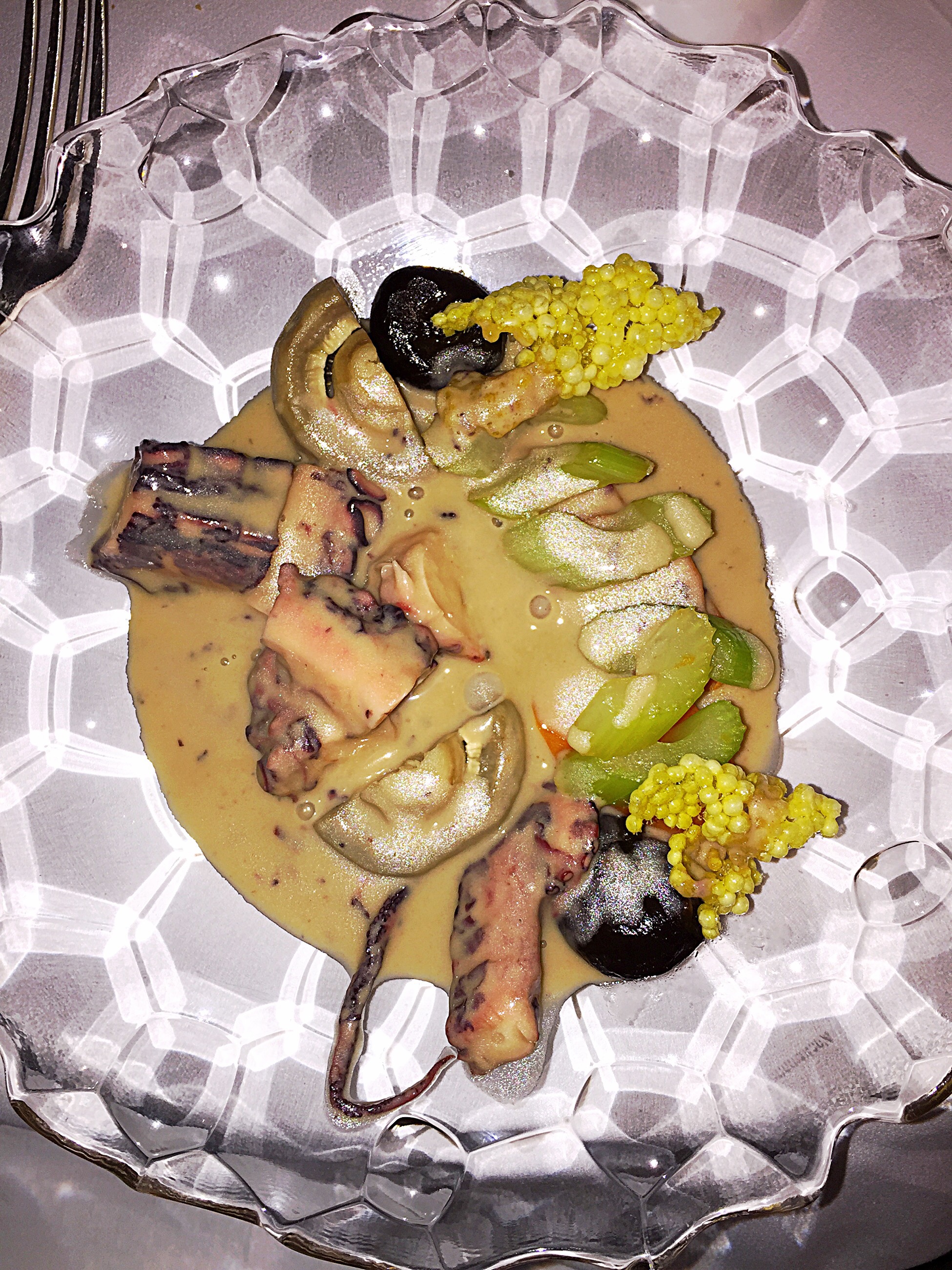 Blanquette de poulpe aux lies de viognier, carottes , oignons, champignons de Paris, céleri branche, tapioca soufflé