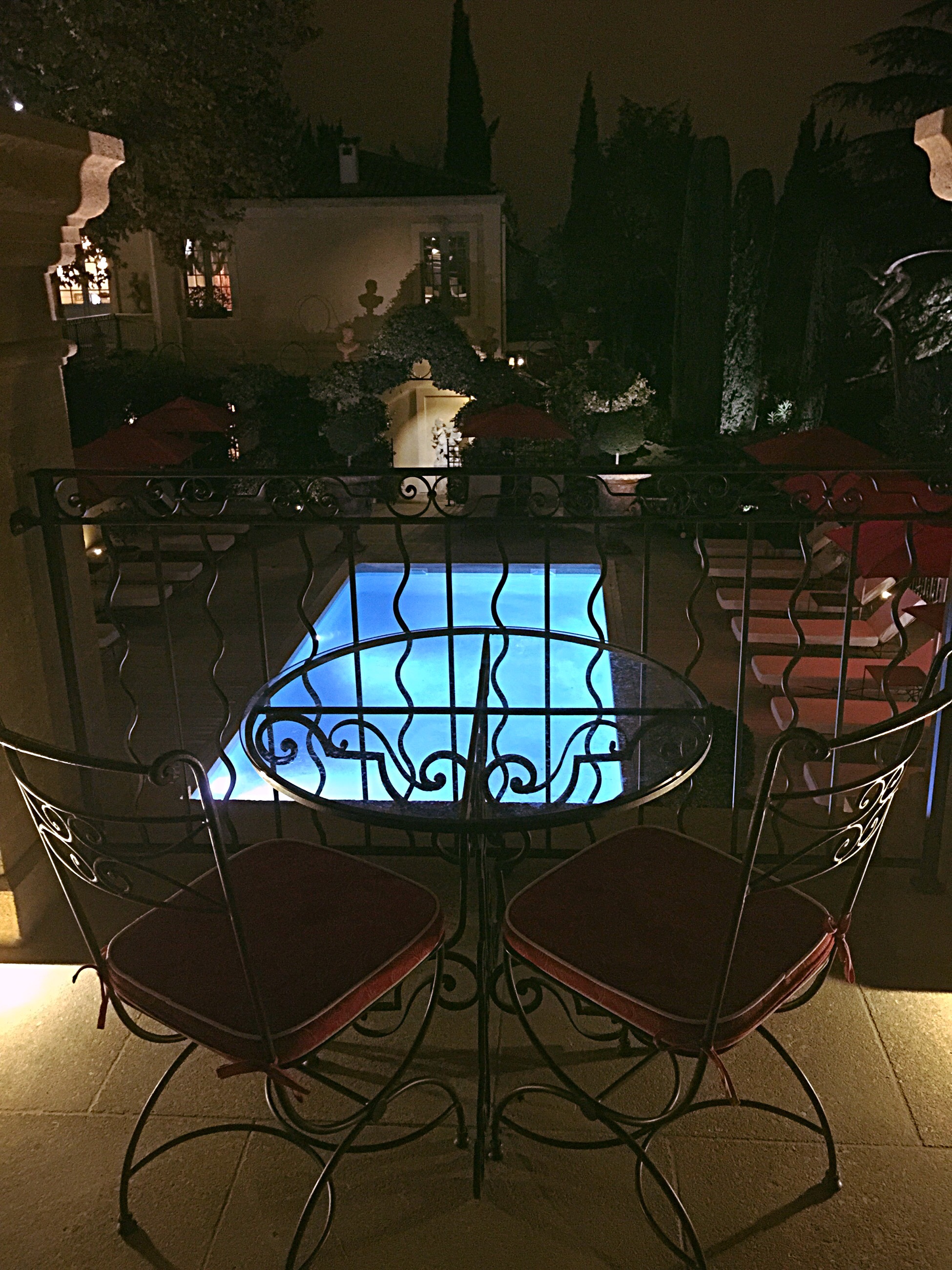 Dès que nous avons franchi le portail de l’entrée nous étions ailleurs, un extérieur si beau et apaisant, il faisait nuit mais les chemins, l’hôtel et la piscine éclairés donnaient un charme spécial à cette demeure provençale du XVIIIème siècle (je n’ai pas encore eu l’occasion de découvrir l’établissement de jour mais j’ai prévu de tester leur « tea party » en après midi).