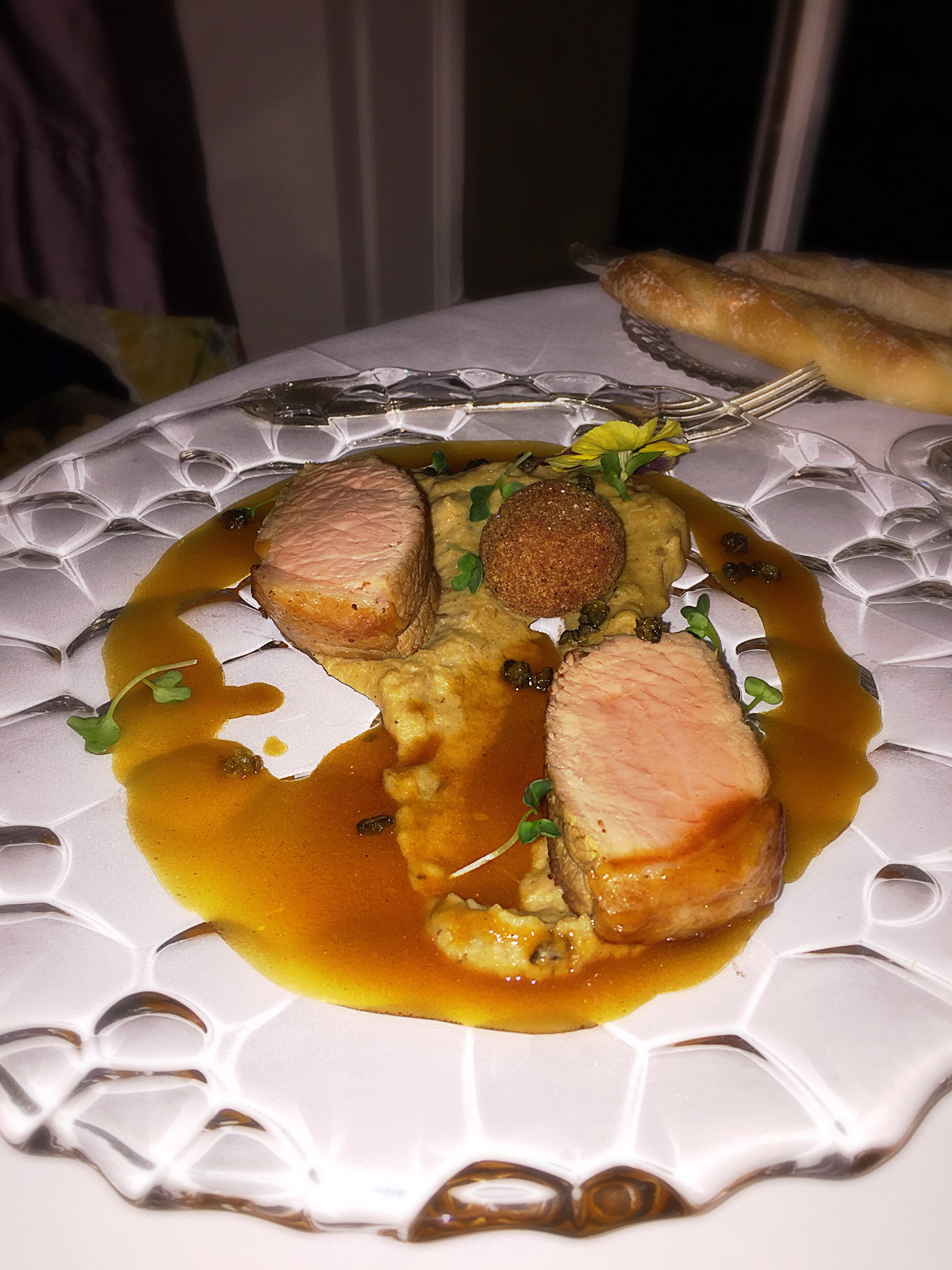 Quasi de veau cuit rosé, croustillant de Jarret, polenta fine crémeuse aux cèpes secs, jus de cuisson et câpres frits
