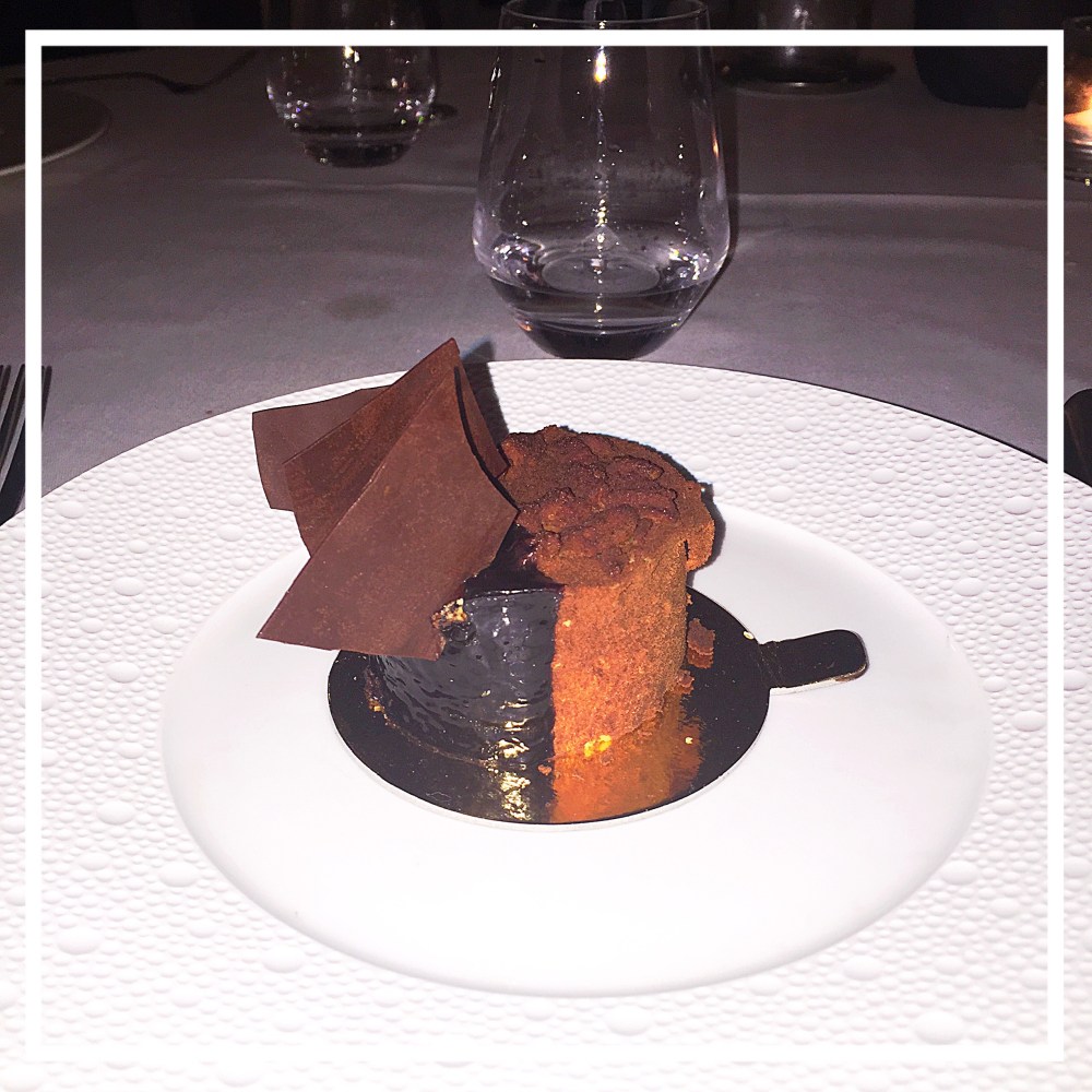 « Risotto de riz noir vénéré, Poêlée d’encornets en persillade, Emulsion à l’encre de seiche » »Entremet poire-chocolat »